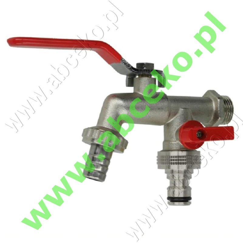 Podwójny zawór kulowy ½" ze stalową dźwignią i dwoma króćcami wylotowymi wyposażony jest w dwie różne dysze ¾" . Wąż ze złączem wtykowym można podłączyć do jednego złącza, a wąż bezpośrednio do drugiego