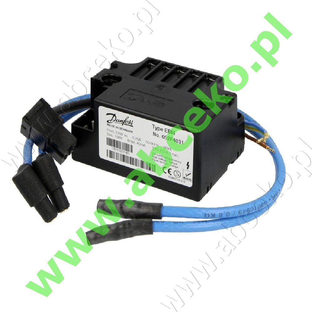 Transformator zapłonowy Danfoss EBI z kompletem kabli do palników olejowych stosowany m.innymi w palnikach BUDERUS